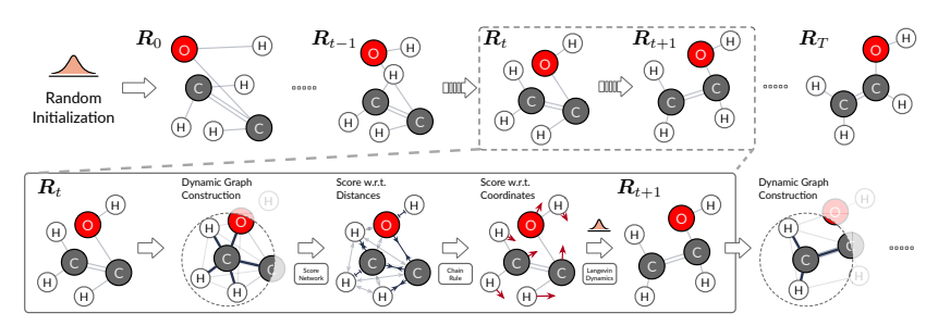 作者的方法将构象生成视为由伪力(即原子梯度)引导的原子依次向高密度区域移动。在Shi等人的带领下,研究者们利用去噪评分匹配来近似原子坐标的对数密度的梯度。为了模拟对局部和长程相互作用(等式 1)敏感的原子梯度,并受到长程相互作用随着距离增加而迅速减少这一事实的启发,作者建议根据当前的空间接近度动态构建在一定距离内的原子对之间具有非键合边的图结构。通过这种方式,使模型能够有效地捕获长程非键相互作用,同时避免连接所有原子,这在计算上是昂贵的。为了确保训练期间图结构的分布与生成期间的分布匹配,作者设计了一种动态图评分匹配算法,其中图结构也在训练期间根据添加的扰动动态确定。整个框架如图2和图3所示。下面作者将在4.1节描述笛卡尔坐标的得分估计框架,在4.2节描述动态图得分匹配算法,在4.3节描述生成过程。