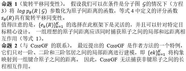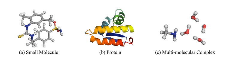 其中 Ebond、Eangle 和 Etorsion 对键合原子之间的局部相互作用进行建模,这些相互作用是在以前的方法中建模的。非键合原子之间的长程相互作用,表示为Enon-bonded,也是非平凡的,它通过不可忽略的静电力或范德华力等塑造分子几何形状。对于多分子复合物,非键相互作用主导复合物的几何结构。因此,构象生成的理想解决方案应该是同时捕获局部和远距离相互作用。在图 1 中,作者展示了三个典型的分子系统,其中长程相互作用在确定它们的构象方面起着关键作用。