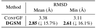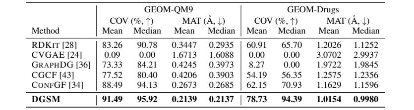 将 DGSM 与 5 个最先进的方法进行比较:RDKIT、CVGAE 、GRAPHDG 、CGCF 和 CONFGF。对于测试集中的每个分子,采样的构象是其参考构象的两倍。使用匹配分数 (MAT) 来衡量生成构象的准确性,并使用覆盖分数 (COV) 来衡量多样性。这两个指标都基于分子之间的均方根偏差 (RMSD),同时考虑了对称性。