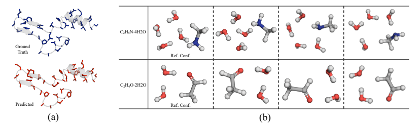 图5 (a) 生成的具有原子级坐标的蛋白质侧链构象的示例 (b) DGSM 生成的两个多分子复合物的构象。