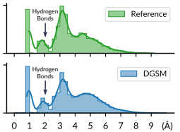 多分子复合物构象 此任务是预测多分子复合物的构象。多分子复合物由多个分子组成,它们之间没有共价键。长程相互作用支配着多分子复合物的结构。此任务的目的是展示 DGSM 对更广泛问题的潜在应用,并为构象生成提供新的基准。作者使用量子化学软件 xtb 构建了一个由24个水-有机复合物组成的数据集,每个水-有机复合物都有数百个构象,其中20个复合物用于训练模型,剩下4个作为测试数据集。不报告基于 RMSD 的指标,例如 COV 和 MAT,因为多分子复合物的结构非常灵活。图 5(b) 显示了两组生成示例。作者观察到水分子规则地放置在溶质有机分子周围。值得注意的是,氢键(水和溶质之间,以及水和水之间)正确形成了。这也可以在氢氧距离的直方图(图 6)中得到证明,其中在 1.5Å 和 2.5Å 之间有一个峰值,即氢和氧之间的氢键长度范围。