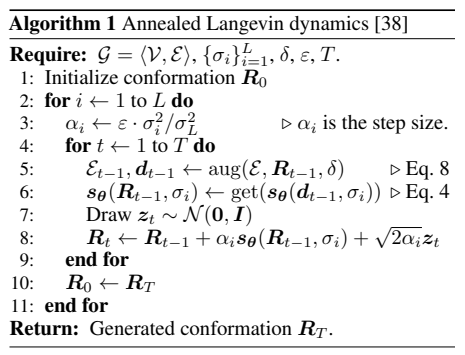 然后使用来自评分网络的梯度信息更新构象(方程 4)。这里提供算法1中的伪代码。