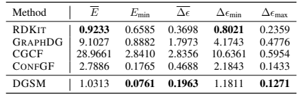 结果 表 2 显示 DGSM 明显优于其他基于机器学习的方法。DGSM 对平均能量 和最小间隙 的估计接近 RDKIT,但仍优于最具竞争力的基于 ML 的方法 CONFGF。构象能的计算对几何形状的变化高度敏感——即使键长的细微偏差也会导致显着的能量变化。因此,DGSM 的优越性能表明它比其他方法生成更准确的构象,从而导致更准确的属性估计。这再次验证了建模远程相互作用的有效性。
