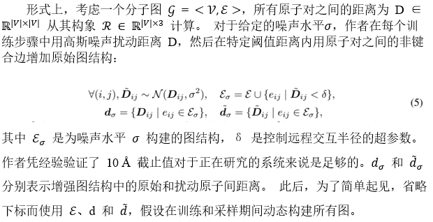 使用上述策略,特定分子图的图结构是可变的并取决于添加的扰动,只要采样足够的噪声,所有图结构都是可能的。这将产生 (1) 一个用于消息传递和表示学习的动态确定的图结构,它考虑了远程相互作用;以及 (2) 一组动态确定的原子间距离,根据等式4它有助于原子坐标的梯度分数估计。请注意等式5 的原始实现需要计算原子对之间的所有距离。在实践中,为了避免二次复杂性,作者在为每个原子添加扰动之前,通过构建具有 2δ阈值的半径图对远邻进行了预过滤,并凭经验验证了这种做法的高效性和有效性。