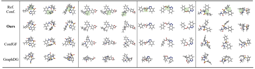 图4 基于来自 GEOM-Drugs 测试集的四个随机分子图,由不同模型生成的构象示例