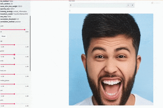 完全解纠缠的状态下,模型能够进一步识别出特征,比如年龄,微笑程度等等。