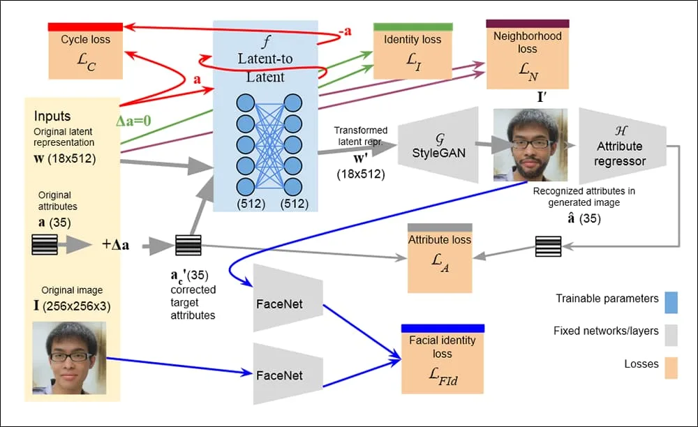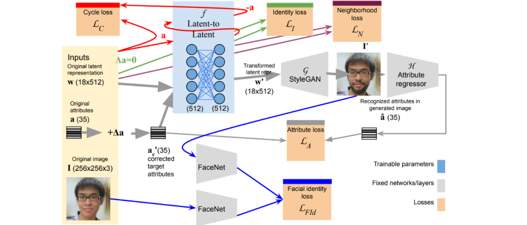 通过在整个生成pipeline上端对端训练网络,该系统可以适应现有的生成器架构的潜空间,并能够保护属性(Conservation properties),如人的身份特征可以在训练损失中进行编码。