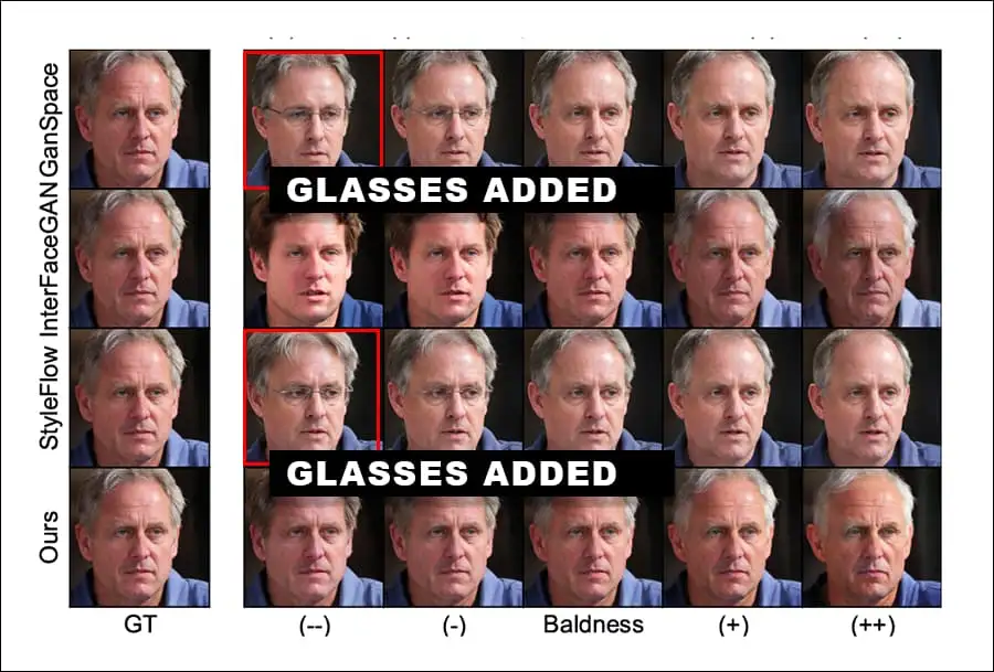 例如,眼镜特征经常与老年人的特征纠缠在一起,这意味着增加眼镜可能也会使脸部「老化」,而想要让脸部老化,可能也会为面部增加一个眼镜,具体取决于高层特征的应用分离程度。