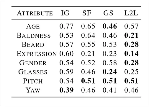 最后量化的实验结果中可以看到,除了在Yaw(头部角度)的实验中,Latent-to-Latent的效果并不理想,其余七个属性的性能基本都处于sota序列。而GANSpace对于年龄和眼镜变化的效果则更优。
