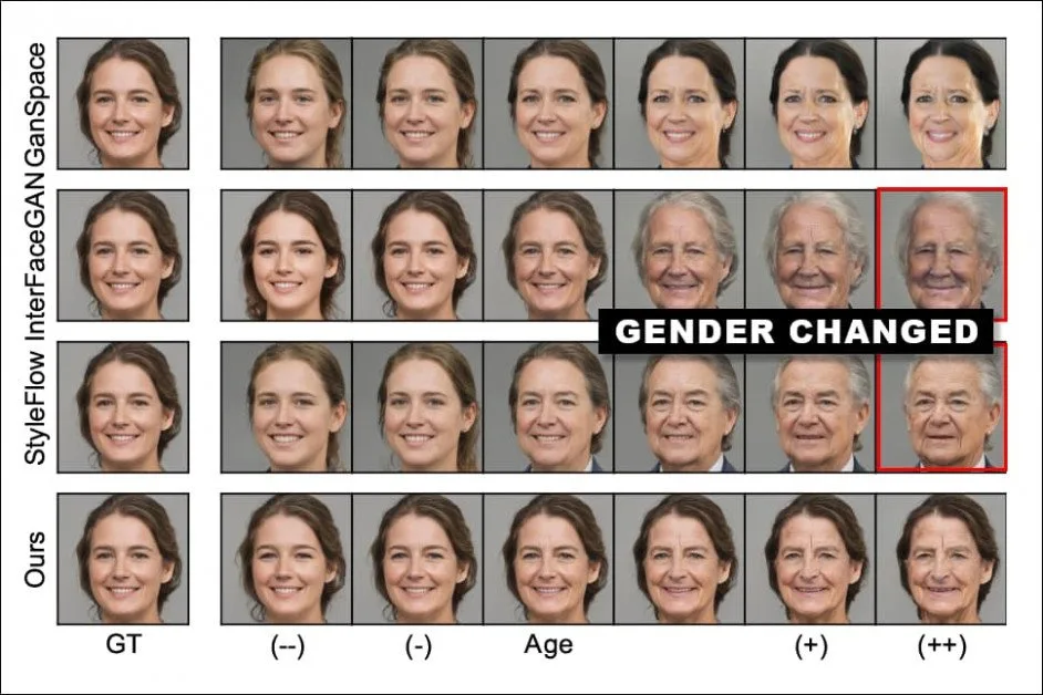 实验结果和预期相符,在其他竞争的模型架构中,图像合成的结果出现了更大程度的纠缠。例如,在一个测试中,当用户要求改变人物年龄时,InterFaceGAN和StyleFlow甚至把主体的性别都给变了。