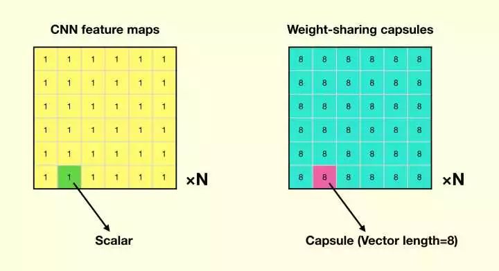 为了加深理解,我们可以对比一下 CNN 的输出和这层输出的 Capsules 的区别: