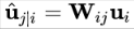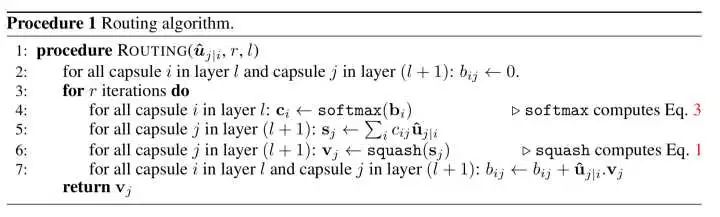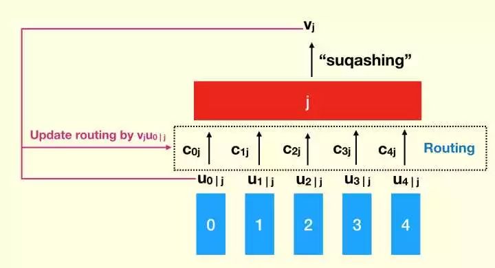 (其中 u 是下层的向量,由前层的标号为 i 的 capsule 产生,带帽子的 u 是处理后的结果,送给后层的标号为 j 的 capsule)。