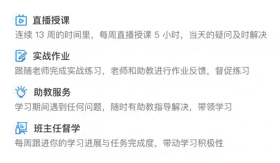 考虑到大家在学习过程中经常遇到的障碍,比如“遇到问题无法及时解决、拖延症、缺乏实战”等等,我在训练营中也专门设计了相关的学习服务:
