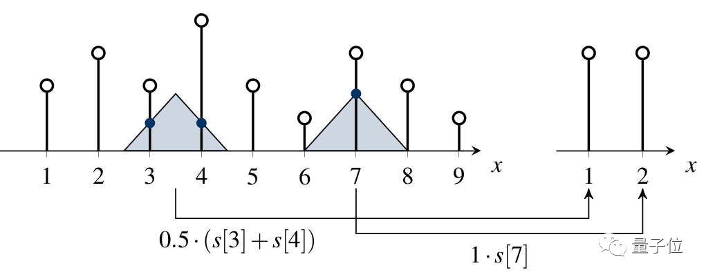 压缩图的像素是这样算出来的:滤波器窗口在图片源信号s上移动,将窗口中的每个像素值(图中圆圈)乘以该位置窗口上的权重,得到缩略后的点值。