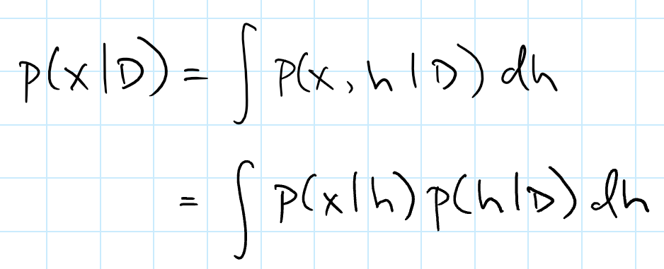 但是如果我们试着用近似方法求积分呢?如果按通常的独立同分布假设,我们可以利用这个事实:未来可能出现的数据样本值 x 条件独立于给定参数 h 时的观测值 D。