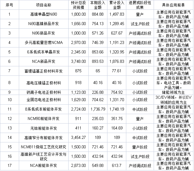 具体来看,除了应用于传统液态电池的高镍三元正极材料产品以外,公司在研项目还包括可用于传统液态电池和半固态电池的高镍单晶型Ni90、Ni90高镍新品以及超高镍产品Ni96新品;同时覆盖了目前特斯拉路线的NCA和NCMA产品。