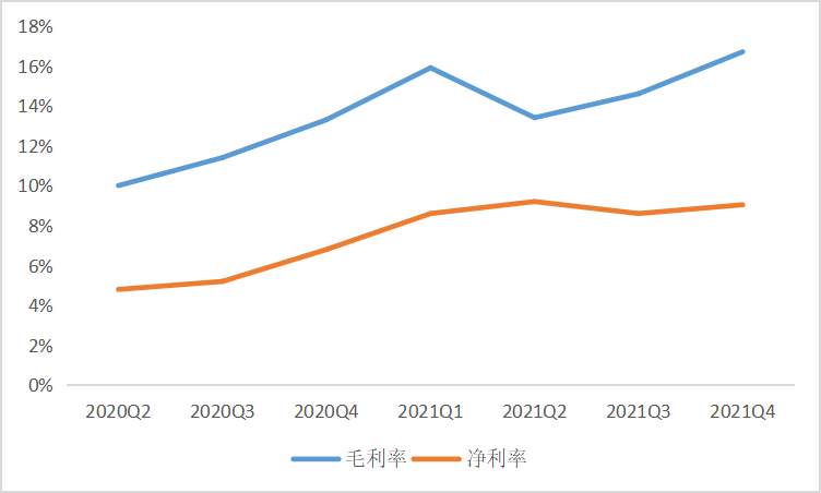 盈利能力方面,2021年公司毛利率录得15.34%,较去年同期提升3.17pct。分季度来看,Q1- Q4公司毛利率分别15.9%、13.44%、14.62%和16.67%;2021年公司净利率录得8.85%,较去年同期提升3.33pct。分季度来看,Q1-Q4公司净利率分别为8.58%、9.16%、8.56%和9.04%。