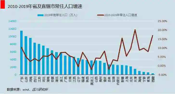 在以人口机械增长衡量的人口流动情况中可以清晰地看到,2019年浙江和广东人口净流入不仅位居前二,而且远高于其它省市。同时,在前十大人口净流入省市找那个,除了新疆与西藏之外,清一色为南方省份。