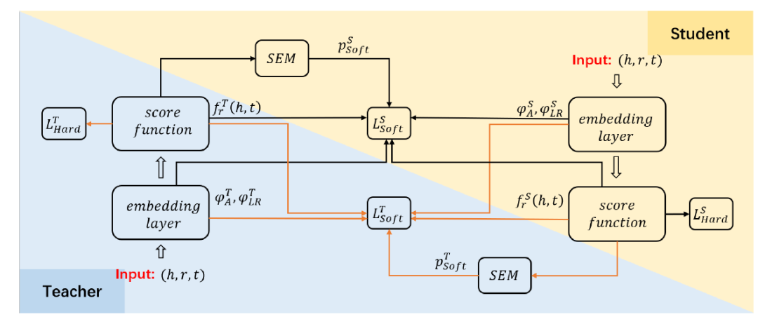 上一部分介绍了如何让学生从 KGE 教师那里提取知识,其中学生用硬标签训练,软标签由固定教师生成。为了获得更好的学生,我们提出了一种两阶段蒸馏方法,通过解冻教师并让其在蒸馏的第二阶段向学生学习来提高学生对教师的接受度。(1)第一阶段。第一阶段类似于传统的知识蒸馏方法,其中教师在培训学生时保持不变;(2)第二阶段。在第二阶段调整教师的同时,对于那些学生没有掌握好的三元组,我们也希望减少学生的输出对教师的负面影响,让教师更多从硬标签中学习,从而以保持教师的高准确性。因此,我们也将软标签评估机制应用于教师的调整。通过评估学生给每个三元组的分数,教师的硬标签和软标签的权重被自适应分配。在此阶段,教师和学生一起优化。