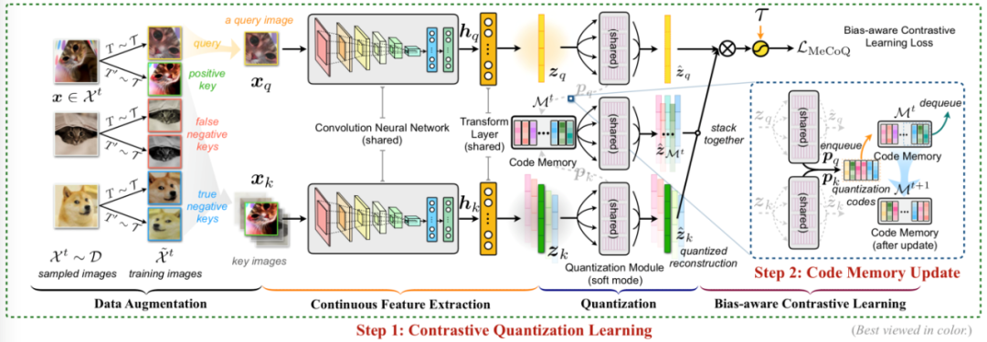 量化(Quantization)是一种向量压缩的技术,被广泛应用于大规模的图像检索。无监督的量化表征学习是一个贴近实际而又充满挑战的问题,现有方法大部分是重建式的技术路线,目标是最小化量化前后的语义损失。这些方法都依赖于预训练卷积神经网络的表达能力和泛化性能,预训练网络提取的特征的质量决定了量化后的表征的质量。不同于这些方法,作者从近期对比学习的相关工作中得到启发,并尝试利用该技术学习量化表征,从而减轻对预训练网络的依赖。对比学习是一种有效的无监督表征学习方法,通过数据增广的方式挖掘图像中的语义不变性,指导模型学习。