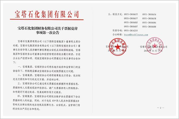 7月,宝塔财务公司发布公告,承认“由于工作上的失误,对风控兑付问题未进行严格统筹,造成持有宝塔票据的客户未能如期兑付”。公告还给出了最快一周、最慢40天的逾期票据兑付安排。