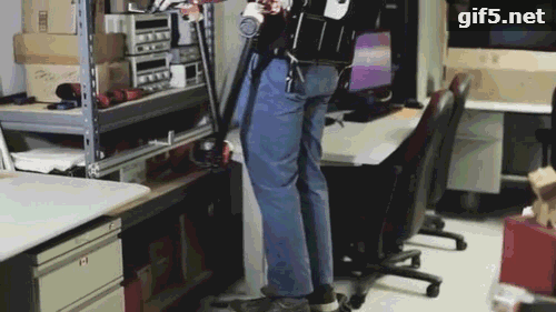 开发者对于这款装置的另外一个使用灵感来自于清洁工擦窗户的场景。很多清洁工一般用一只手抓住房梁来保证自己身体的平稳,另一只手用来擦窗户。在这种场景下,开发人员将背包的手臂设计成可以移到下端钩住固定的梁,这样人就可以空出两只手来擦玻璃了。