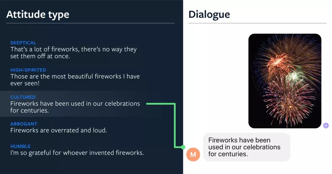 为了与人类交往,智能体不仅应该能够理解对话,还应该能够理解图像。当人们彼此交流,谈论他们周围的事物时,他们不会做出中立的观察,而是表达自己的观点。对图像进行评论的机器学习方法通常侧重于图像里的字幕,这种字幕在语气上是真实的、中立的,就像 “fireworks in the sky.”。在我们的研究中,我们关注的是通过融入个性为人们带来吸引力的图像字幕。我们收集了大量基于图像的人类评论数据集,并训练了最先进的模型,使其能够与特定任务讨论图像,这使得系统对于人类来说更有趣。人们有 64.5% 的情况更喜欢基于个性化的字幕,而不是传统的字幕。