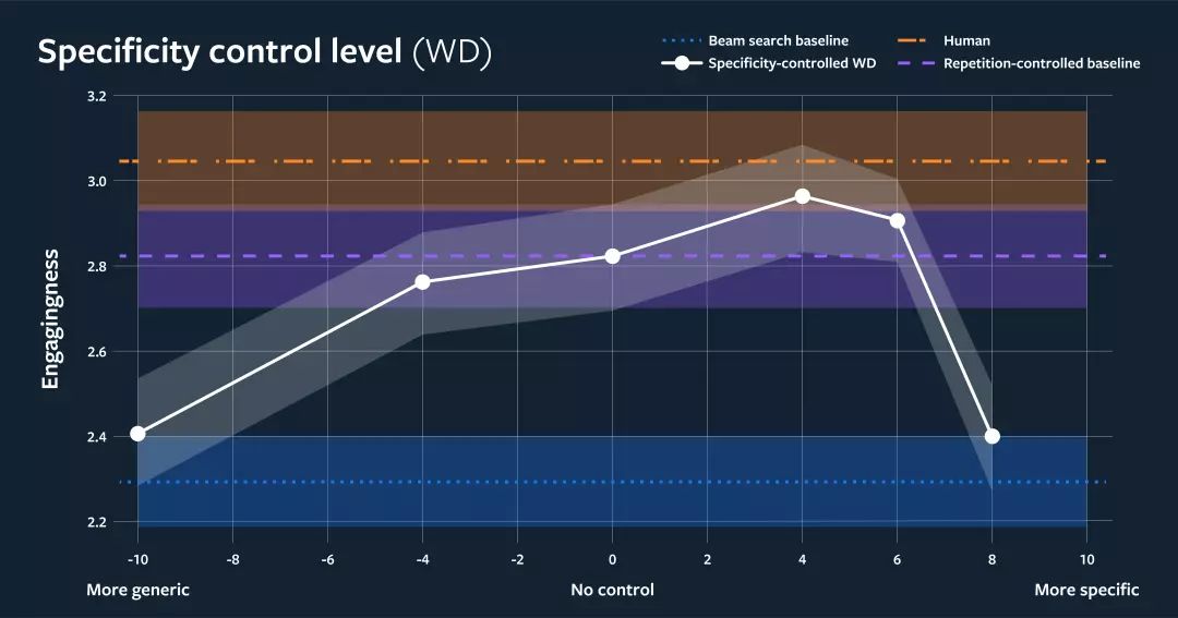生成式对话模型经常默认使用通用的、安全的响应,比如 “I don't know”。在与斯坦福大学人工智能研究员 Abigail See 的合作中,我们研究了如何通过控制一些会话来解决这个问题,比如特异性水平。当人们参与一个交谈时,我们发现他们明显更喜欢更具体的回应,而不是一般的回应。人类注释者对我们的特异性控制模型是这样评价的:在迷人方面,我们的模型比基线模型要高 28%,在人情味方面则要高出 32%。多样性是交谈的“调味品”。