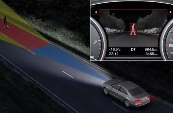 汽车夜视系统,利用红外线技术能将黑暗变得如同白昼,使驾驶员在黑夜里看得更远更清楚。夜视系统的结构由 2 部分组成:一部分是红外线摄像机,另一部分是挡风玻璃上的光显示系统。