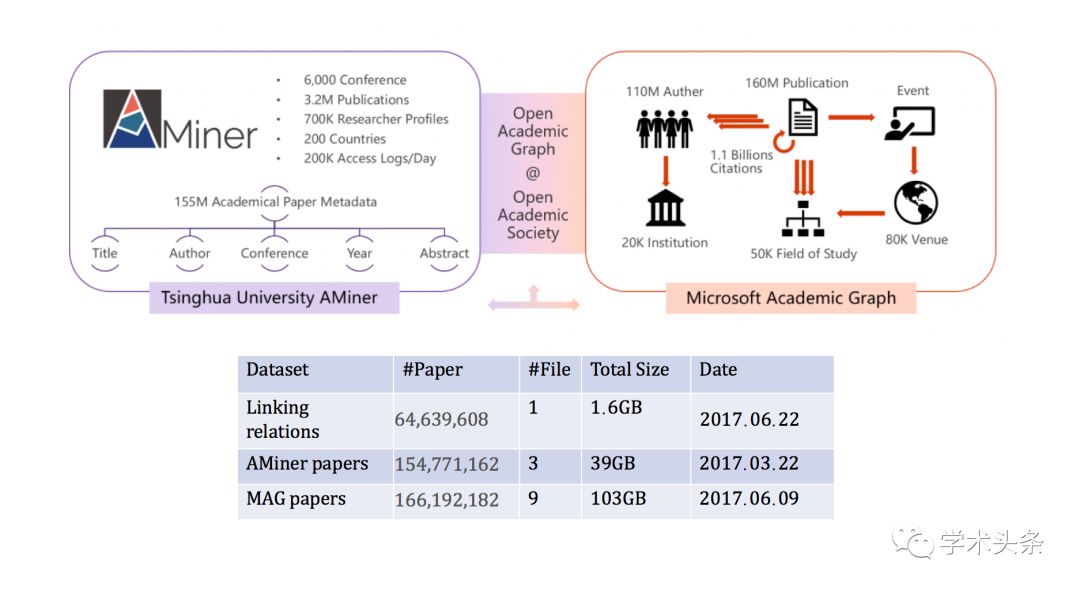 2017年8月,清华大学和微软研究院联合发布的 OAG v1,具体来说包含了来自 MAG 的 166,192,182 篇论文和来自 AMiner 的 154,771,162 篇论文的元数据信息。