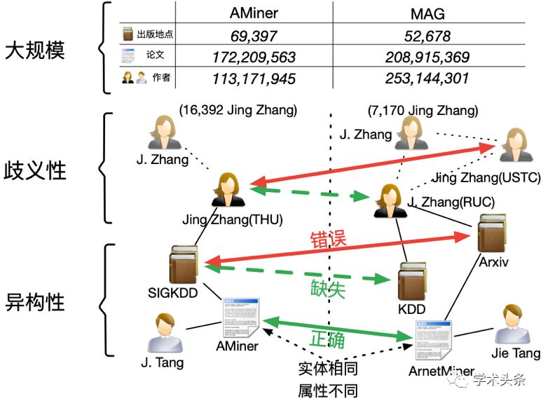 构建亿级开放学术图谱是一项极具挑战的研究工作。下面举例说明主要的难点所在: