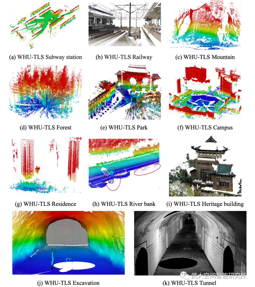为加快推进深度学习在3维点云处理领域的快速发展,赋能点云智能,课题组结合课题组近十年来的数据积累,联合慕尼黑工业大学、芬兰大地所、挪威科技大学、代尔夫特理工大学发布全球最大规模和最多样化场景类型的TLS点云配准基准数据集。本次公开的WHU-TLS基准数据集涵盖了地铁站、高铁站、山地、森林、公园、校园、住宅、河岸、文化遗产建筑、地下矿道、隧道等11种不同的环境,共包含115个测站、17.4亿个三维点以及点云之间的真实转换矩阵。此外,该基准数据集也为铁路安全运营、河流勘测和治理、森林结构评估、文化遗产保护、滑坡监测和地下资产管理等应用提供了典型有效数据。我们热忱欢迎相关科研工作者通过课题组网站: