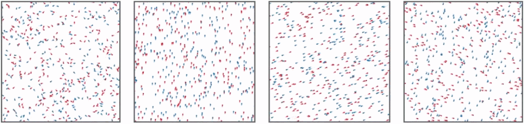 研究者还模拟了红蓝两组以恒定速度移动且彼此之间具有不同关系的智能体。图 1 中,红蓝智能体随机移动。到了图 2,红蓝智能体往同一方向飞行,自发地打破了对称性并表现出群集行为。图 3 中,当红蓝智能体相向移动时,出现了类似的反群集相。到了图 4,红蓝智能体开始了原地旋转,形成另一种自发对称性破缺的情况。