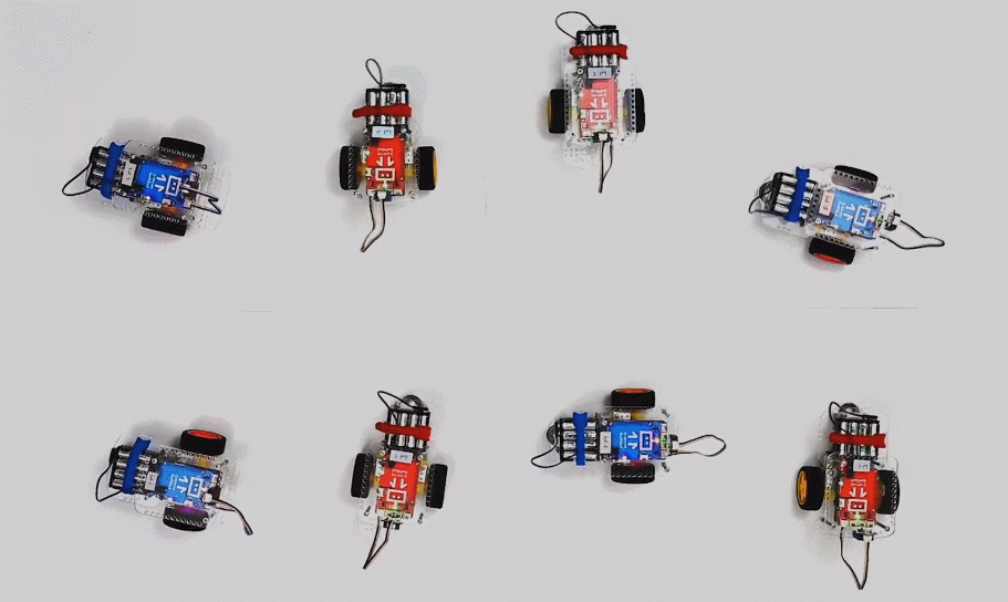 因此,研究者开发了一组两轮机器人,它们在编程中表现出非互易性。这些机器人小巧可爱且操作简单。他们使用一些颜色编码的行为对它们进行编程,其中红色和蓝色机器人的动作各自保持一致。