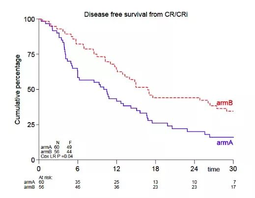 研究数据表明阿扎胞苷用于这类患者的维持治疗是可行的。随机化时对诊断时低风险细胞遗传学异常和血小板计数调整后,阿扎胞苷维持治疗组的DFS明显更好(作为CR与CRi的替代指标; Cox回归;HR=0.62; 95%CI,0.41~0.95; P = 0.026)。阿扎胞苷组的12个月DFS估计为64%,对照组为42%(P = 0.04);24个月和36个月DFS估计为44% vs 20%和32% vs 16%。
