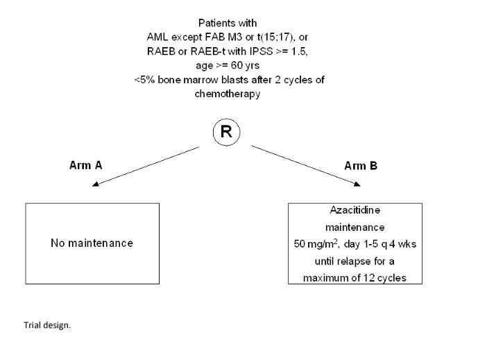 该随机3期研究(HOVON97)入组了年龄不小于60岁的急性髓系白血病或伴顽固性贫血、原始细胞过多的骨髓增生异常综合征(MDS)患者,并且在至少2个周期强化疗治疗后获得CR或血液学恢复不完全的CR(CRi)。研究人员评估了阿扎胞苷作为缓解后治疗在无病生存率(DFS;主要研究终点)和总生存率(OS;次要研究终点)方面的作用。