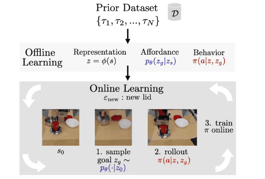 给定一个展示各种环境可供性的先验数据集,VAL在三个离线步骤中消化这些信息:用于处理高维真实世界数据的表示学习,在未知环境中实现自监督练习的可供性学习,用于获得高性能的初始策略以加快在线学习效率的行为学习。