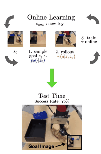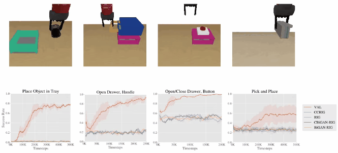 现在,当VAL被放置在一个未见过的环境中时,它使用其先前的知识来想象有用可供性的视觉表示,通过尝试实现这些可供性来收集有用的交互数据,使用其自我评估指标更新其参数,并一直重复整个过程。