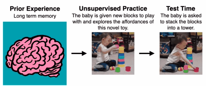 为此,我们面临几项挑战。当机器人被置于一个新环境时,它必须能够利用其先前的知识来思考环境可能提供的潜在有用行为。然后,机器人必须能够实际地练习这些行为。为了在新的环境中改进自己,机器人必须能够在没有外部奖励的情况下以某种方式评估自己的成功。