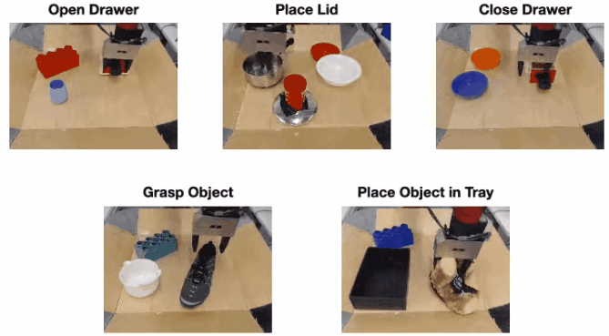 如下图所示。在左侧,我们先收集了由机器人完成各种任务的视频,比如打开和关闭抽屉、抓取和移动物体。在右侧,我们放置了一个机器人从未见过的盖子。机器人被给予一小段时间来熟悉这个新物体,之后它将获得一个目标图像,并负责使场景匹配这个图像。机器人如何在没有任何外部监督的情况下迅速学会操控环境并抓住盖子?
