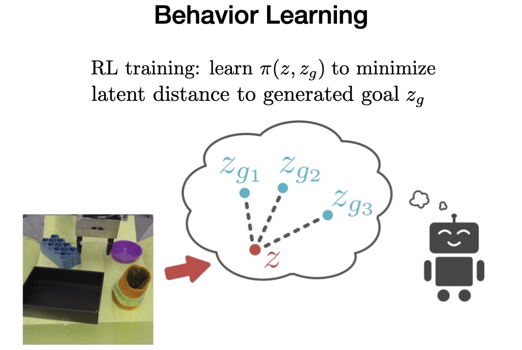 在这个潜在空间的距离是有意义的,为我们自我评价成功的关键机制铺平了道路。给定当前图像s和目标图像g,我们将它们编码进潜在空间,并设定它们可以获得奖励的距离阈值。