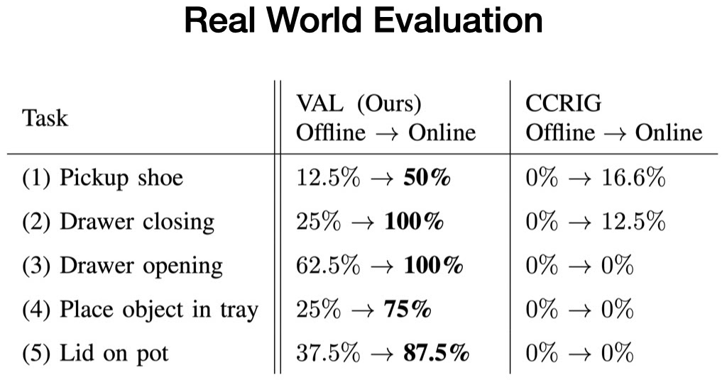 我们发现,在这些环境中,VAL在离线训练后始终显示出有效的零样本泛化,随后通过其可供性导向的微调方案快速改进。与此同时,先前的自监督方法在这些新环境中几乎没有改善。这些令人兴奋的结果表明,像VAL这样的方法具有使机器人成功操纵的潜力,远远超出它们现在习惯的有限的出厂设置。