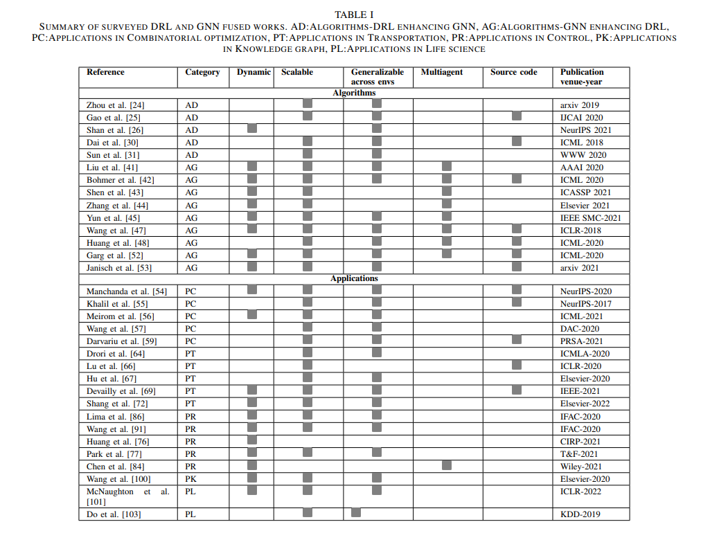 DRL和GNN已经成为现代深度学习中极其强大的工具。DRL利用DNN的表达能力来解决RL的顺序决策问题,而GNN是一种新颖的体系结构,特别适合处理图结构数据。我们确定了两大类联合使用GNN和DRL的研究文章,如图2所示。第一类文章利用GNN(或DRL)对DRL(或GNN)的应用进行算法和方法上的改进。另一方面,第二类文章同时使用DRL和GNN来解决不同应用领域的实际问题。表一描述了调研DRL和GNN融合工程的概况,表二概述了调研论文的个别组成部分。