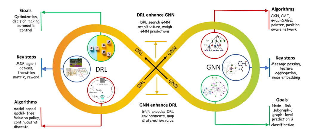 在本节中,我们将讨论着重于开发改进DRL或GNN的新公式或算法的文章。在这些文章中,要么使用GNN来改进DRL的配方和性能,要么使用DRL来提高GNN的适用性。