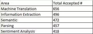 下图是从2011年开始,累计5年发表论文最多的5个领域,这5个领域可以说是当前国际自然语言处理的研究热点: