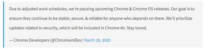 新冠肺炎疫情迫使 Google 在内的众多科技公司实施了远程办公,这显然会影响到现有的工作计划。Google Chrome 官方博客宣布,因工作计划的调整,他们暂停了 Chrome 和 Chrome OS 的发布,当前的优先目标是确保工程师们稳定、安全可靠的工作。安全更新仍然是优先任务,Google 会继续释出安全更新。