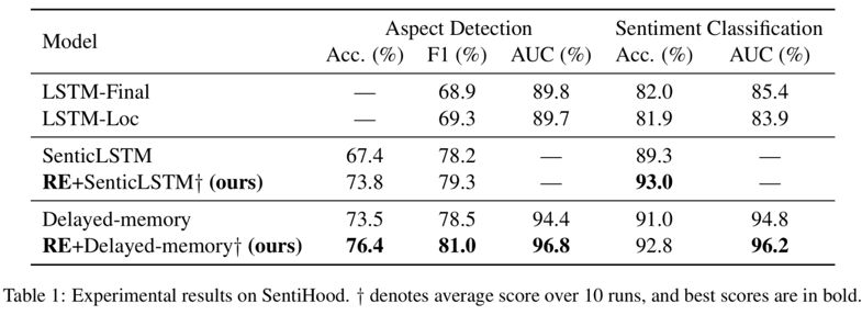 从表中结果可以看出,本文提出的优化目标和方面向量表示的方法在目标识别和情感分类任务中都取得了更好的表现,这说明了上下文相关的目标和方面表示能提升模型在细粒度情感分析任务中的效果。同时我们可以发现本文提出的目标-方面向量表示可以适用于大部分基于深度学习的目标-方面文本情感分类模型。
