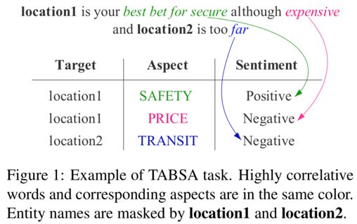 句子中的“location1”和“location2”是两个不同的目标,每一个目标会对应多个方面(Safety,Price,Transit 等),并且不同的方面可能会存在不同的情感极性。这里有一个有趣的现象,如果将“location1”和“location2”的位置交换,那么“location1”和“location2”所表达的方面和情感都会发生改变。所以,如何通过语境上下文精确推断目标和方面的相互关系以及文本对不同方面对象表达的情感是目标-方面级别情感分析任务的主要挑战之一。