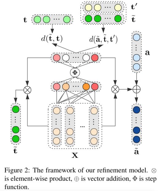 在训练过程中,1)针对目标表示,我们希望获得的上下文相关目标向量尽量接近输入的目标向量,2)针对方面表示,我们希望上下文相关的方面表示尽可能靠近和它相关联的目标,远离无关的目标。