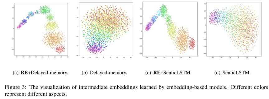 可视化部分,本文使用了 t-SNE 对模型学习到的方面向量表示中间结果进行可视化对比实验。从图 3 结果可以看出,本文提出的方法能使不同方面在训练过程中得到更好的区分,有效提升了方面向量表示的质量。